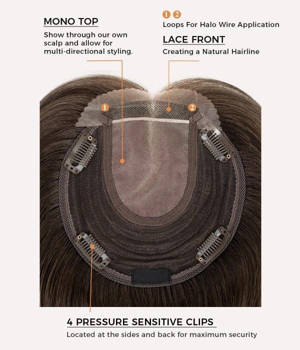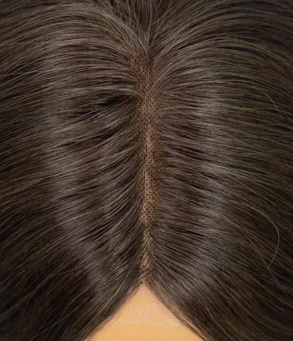 This topper features a 6×6 inch monofilament lace top, providing balanced coverage