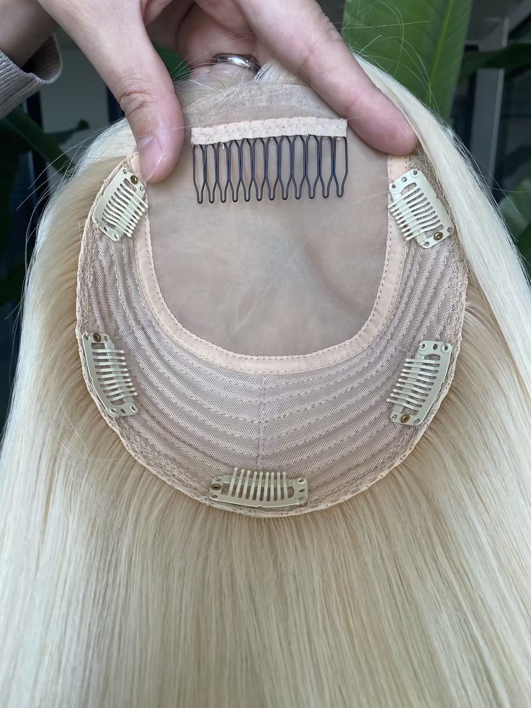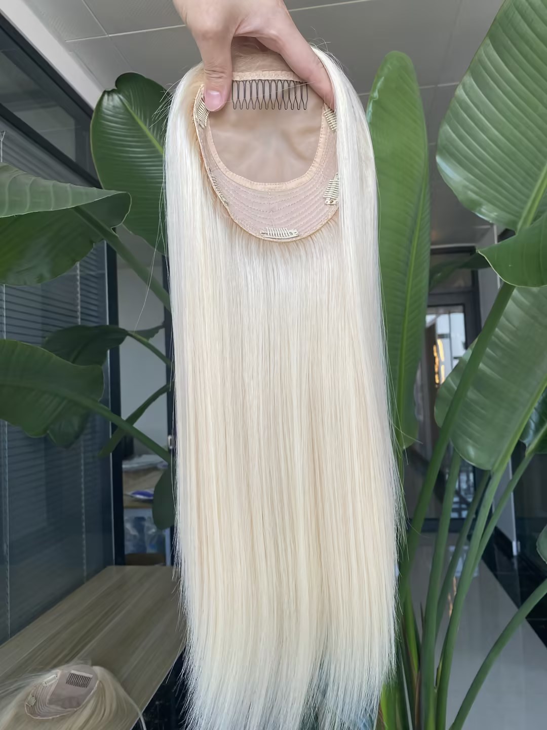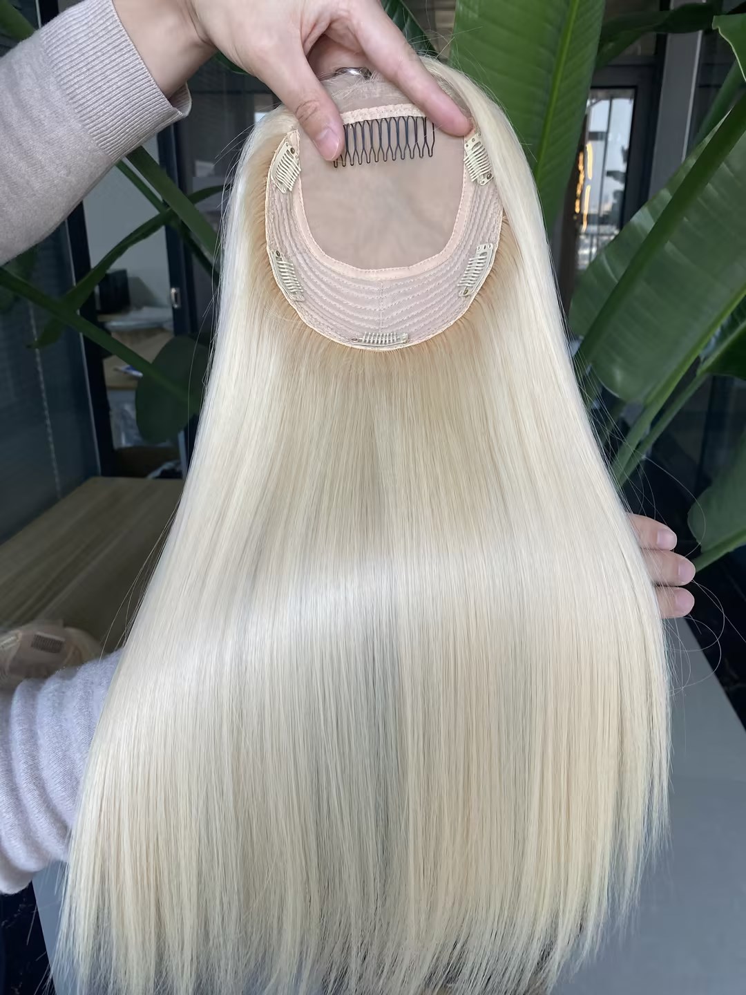 This topper comes in a classic #613 blonde color, a highly sought-after shade in the professional market. The #613 blonde color offers a bright, clean look that suits many different hair tones and is perfect for clients who want a natural blonde appearance.