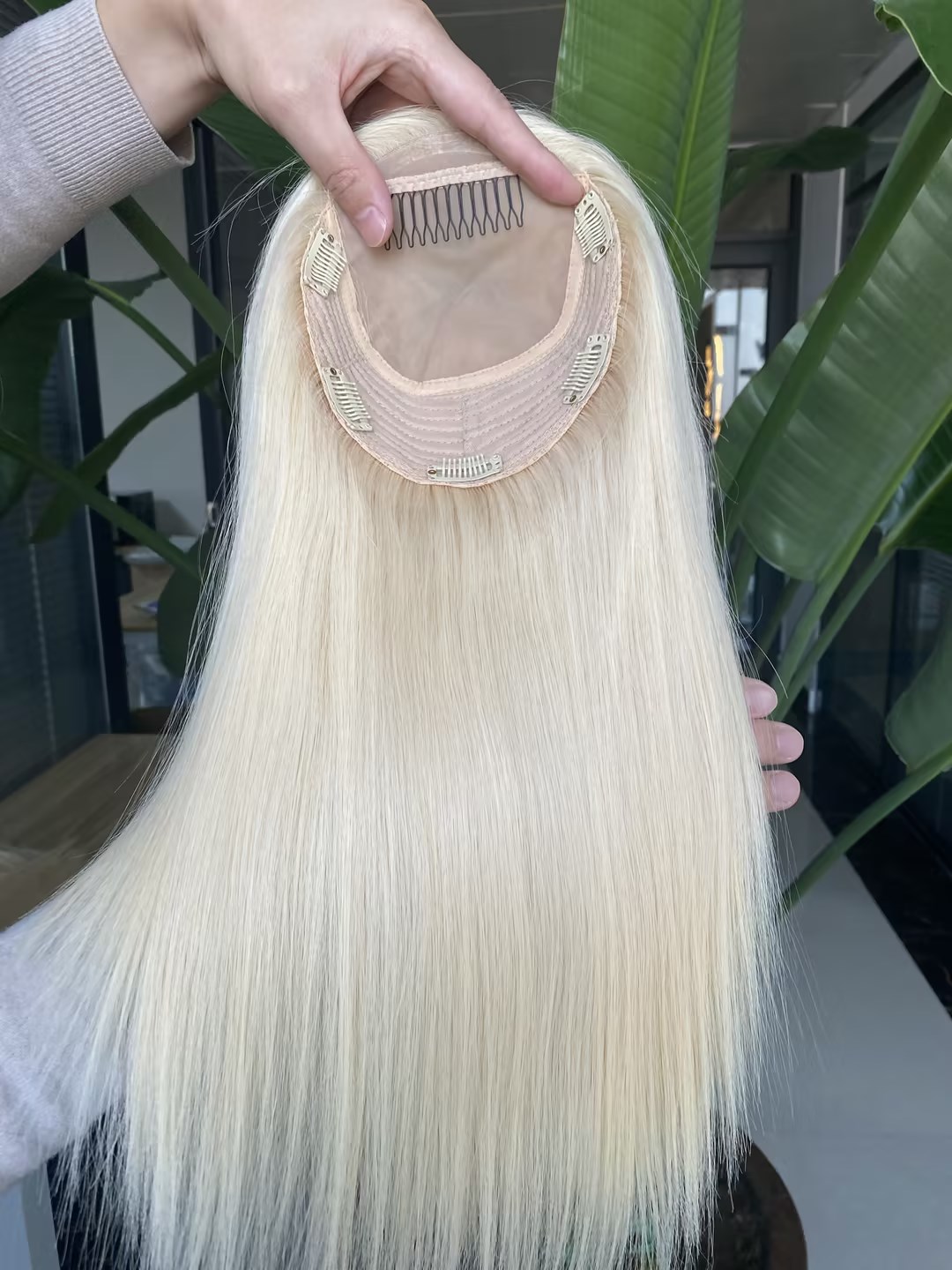 This topper is supplied in a clean #613 blonde color, a popular shade for light, fashion, and blonde markets. As a factory wholesale manufacturer, we provide full OEM / ODM services, including customization of size, density, texture, and color.